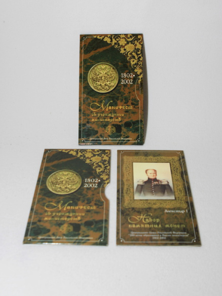 - Манифест об учреждении министерств: иностранных дел, юстиции, финансов, внутренних дел, экономического развития и торговли, образования, Вооруженных сил — все монеты номиналом 10 рублей;
