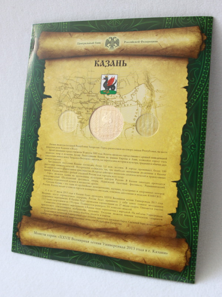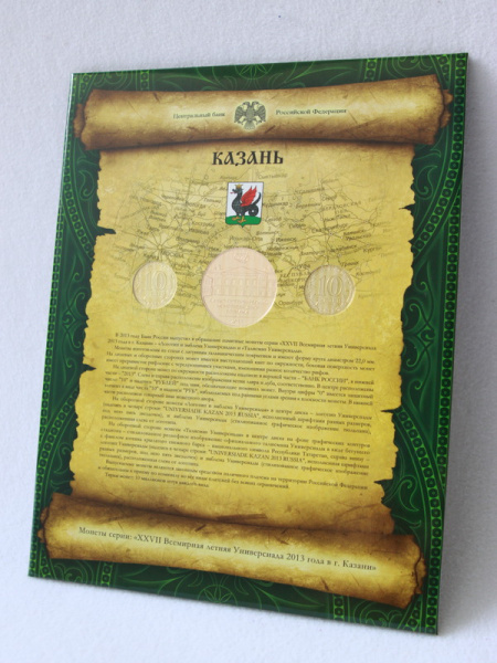 - XXVII Всемирная летняя Универсиада 2013 г. в г.Казани: набор монет номиналом 10 рублей включает Логотип и Эмблему Универсиады, Талисман Универсиады;