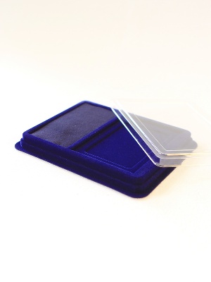 Верхняя часть упаковки выполнена из флокированного пластика, снизу к упаковке приклеен белый глянцевый картон. Готовый футляр сверху накрывается прозрачной пластиковой крышкой