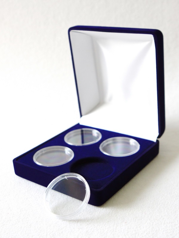 Футляр предназначен для 4 монет в капсулах. Внешний диаметр капсул 46 мм