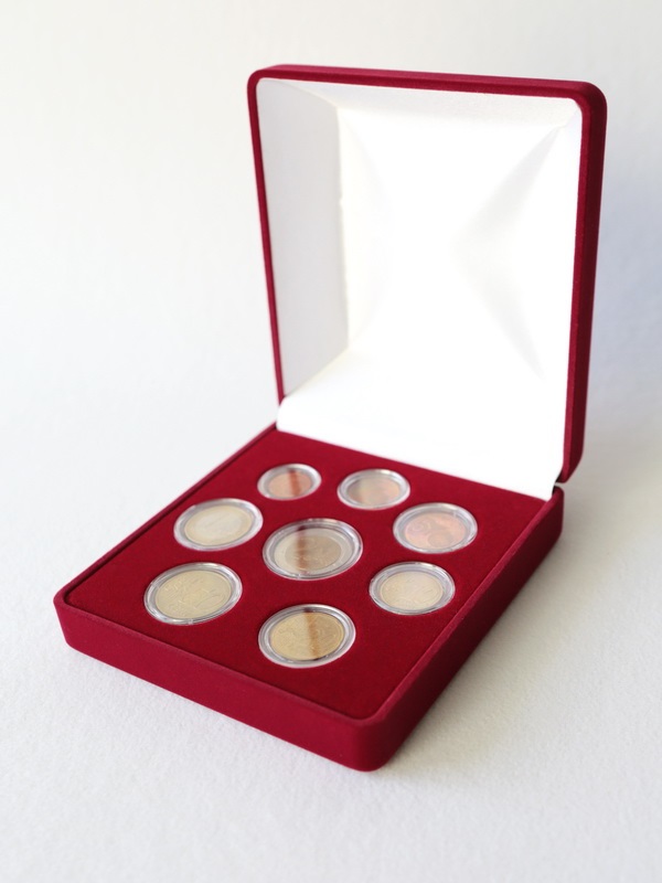 Футляр предназначен для хранения одного набора монет Евро (Euro): 1 cent, 2 cent, 5 cent, 10 cent, 20 cent, 50 cent, 1 euro, 2 euro. Монеты должны быть уложены в капсулы Leuchtturm