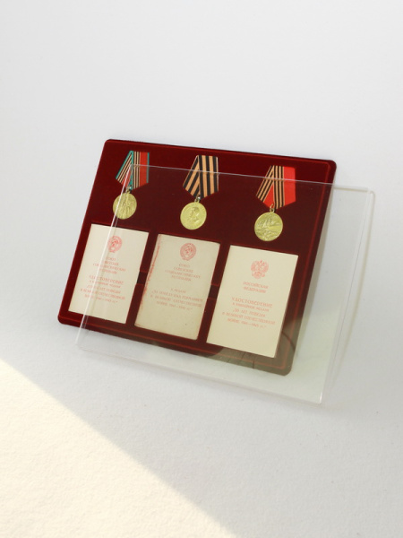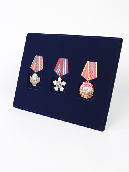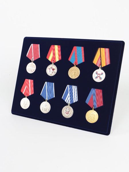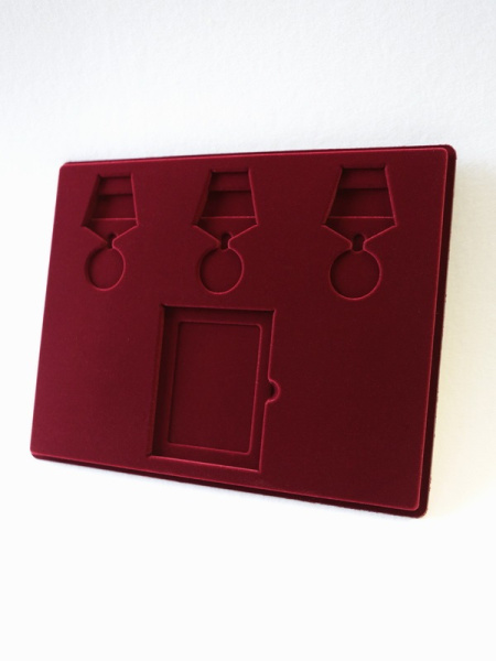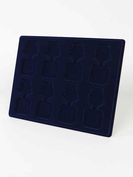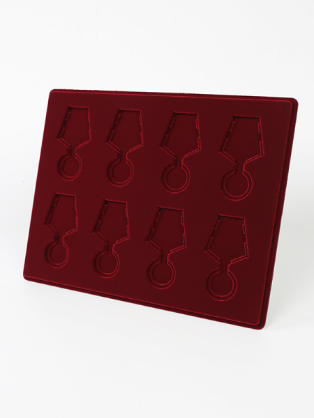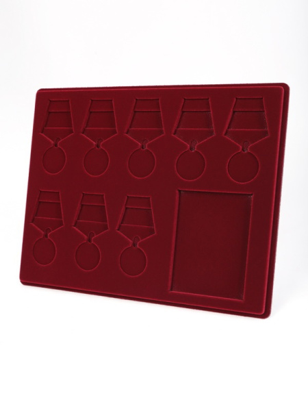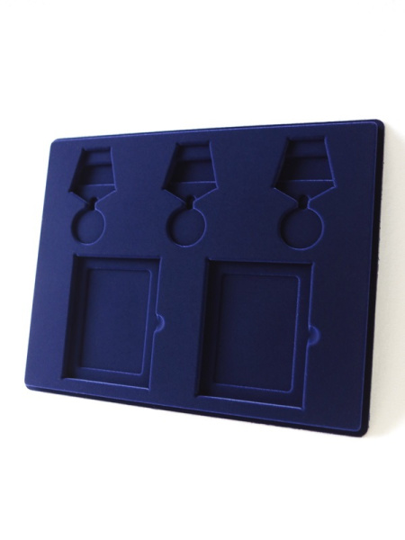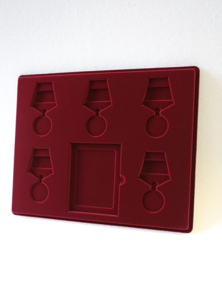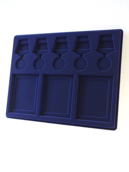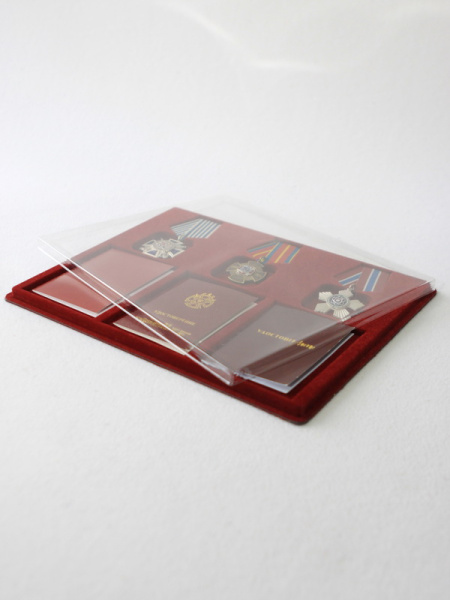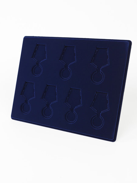 Обратная сторона планшета для медалей серии S изготавливается из прочного пластика, а передняя часть покрыта приятным на ощупь флоком. Пластик черного цвета имеет фактурную текстуру, на которой не видны царапины и загрязнения. Сверху планшет накрывается прозрачной пластиковой крышкой, которая защищает коллекцию от негативных внешних воздействий: влаги, пыли, грязи, механических воздействий. Планшеты для орденов серии S изготавливаются из высококачественных европейских материалов.
