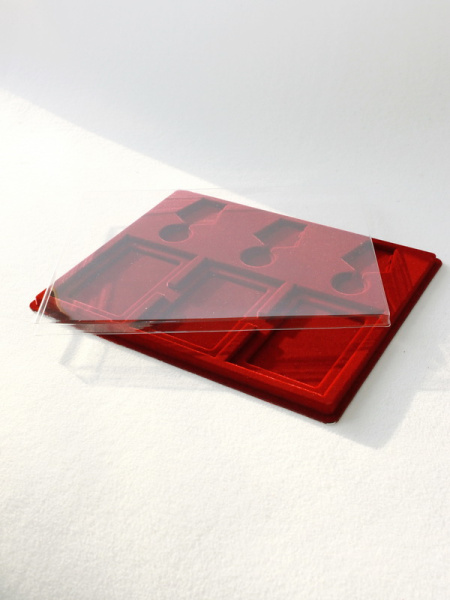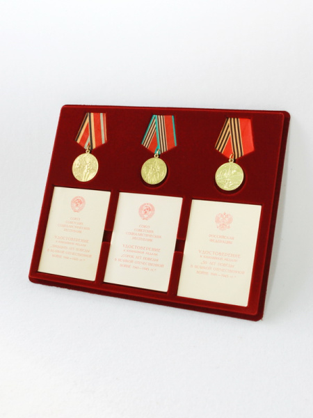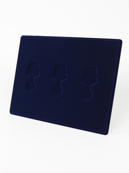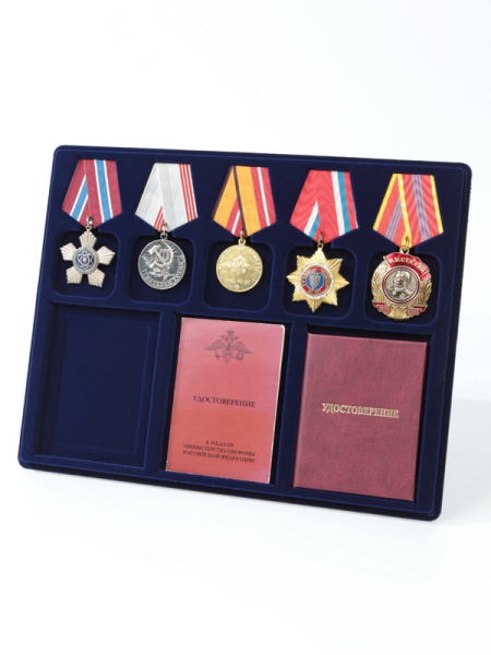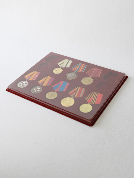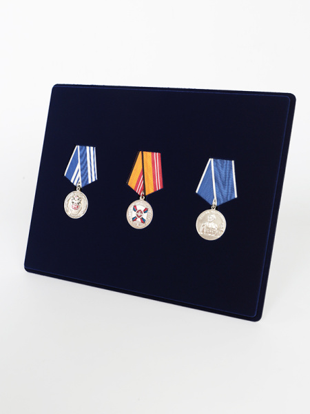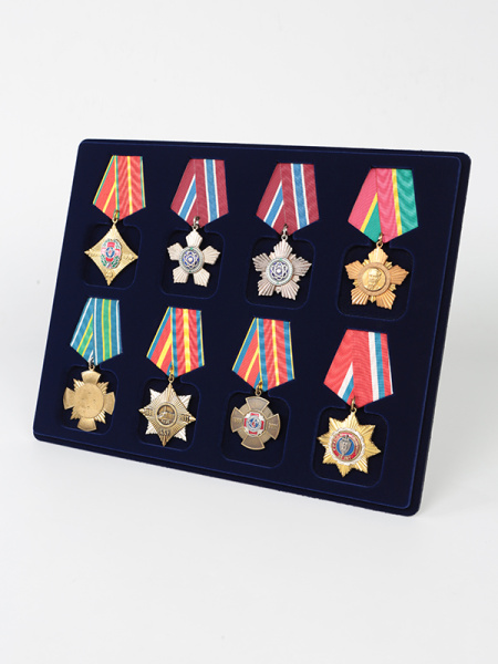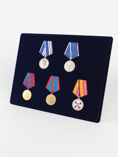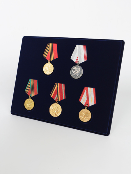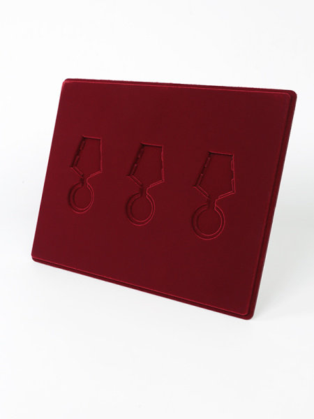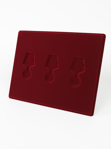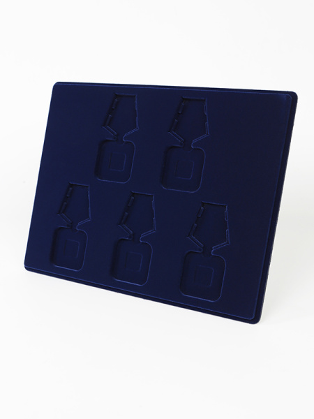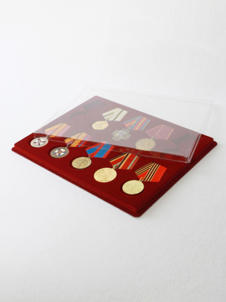Обратная сторона планшета для медалей серии S изготавливается из прочного пластика, а передняя часть покрыта приятным на ощупь флоком. Пластик черного цвета имеет фактурную текстуру, на которой не видны царапины и загрязнения. Сверху планшет накрывается прозрачной пластиковой крышкой, которая защищает коллекцию от негативных внешних воздействий: влаги, пыли, грязи, механических воздействий. Планшеты для орденов серии S изготавливаются из высококачественных европейских материалов.